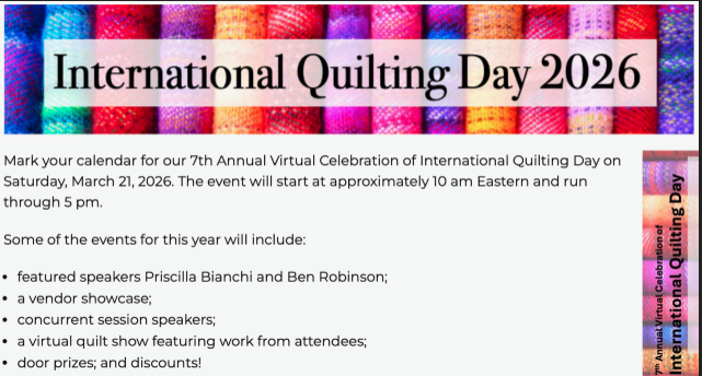 International Quilting Day 2026 will be held on Saturday March 21st, 2026. For all information on the day please visit https://royalcityquiltersguild.ca/iqd2026/