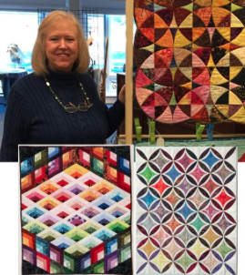 M.J. Kinman talked about her Gemstone quilts. In order to achieve the desired colour and value for her quilts she paints her own fabrics. Her quilts are inspired by famous gemstones. To create her quilts she uses freezer paper to draw the facets of gemstones; facets which are critical to create brilliance in her quilts. She also offers on-line classes and interested parties in her block of the month program can contact her at http://www.mjkinman.com