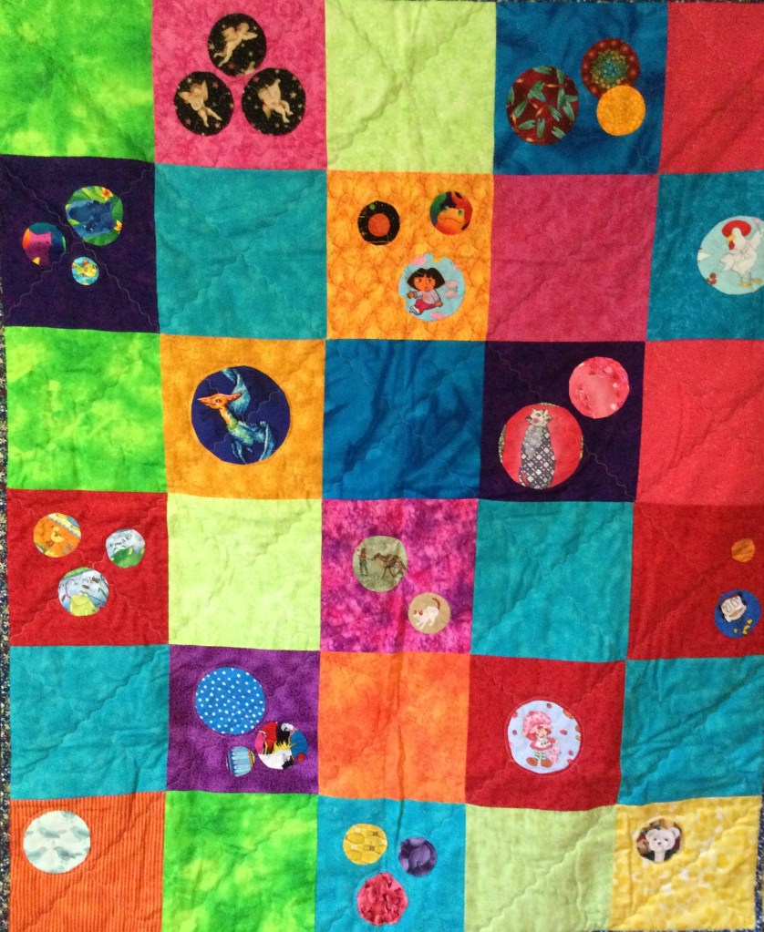 At the February 2019 guild meeting, fussy-cut circles were prepared for members to appliqué onto bright coloured squares. Sufficient blocks were completed that night (and many more brought to subsequent meetings) to complete at least six quilt tops.